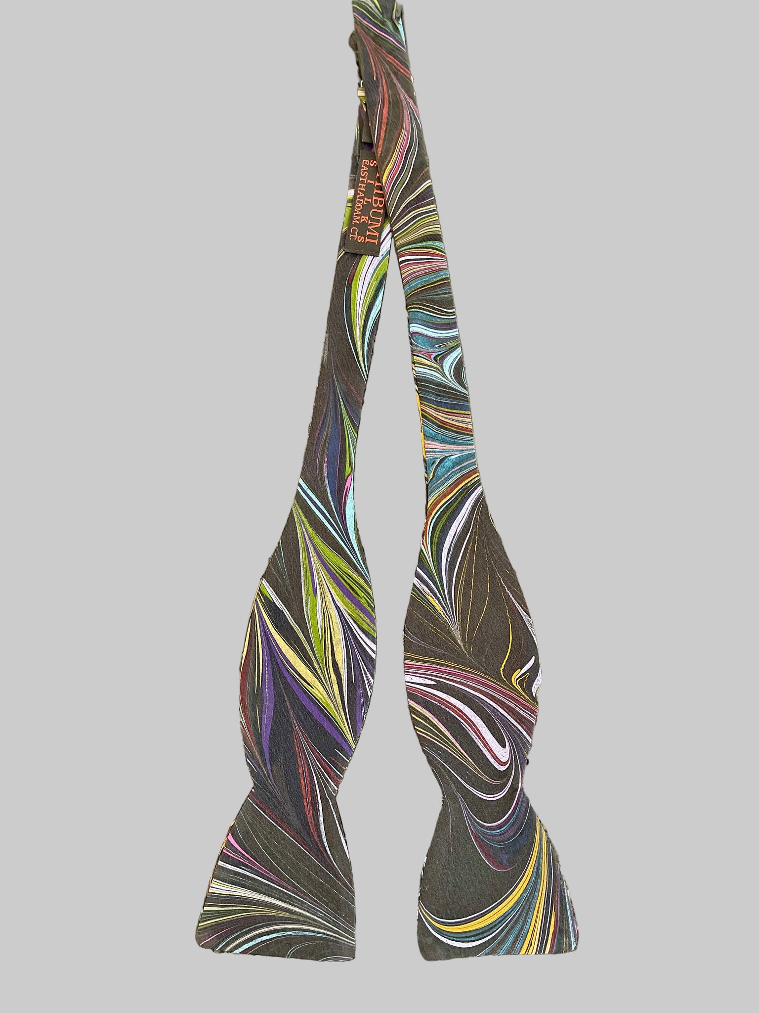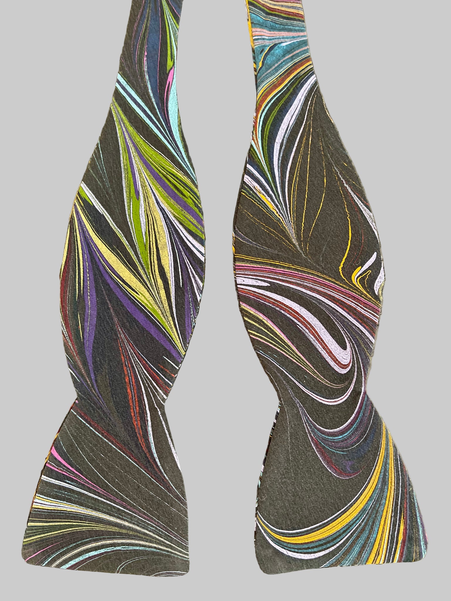 Silk Bow tie. Limited edition. We only get a few ties and bow ties out of each piece of fabric that we dye by hand and then water marble. Each bow tie is one of a kind. Dry cleanable. Each bow tie is packaged in our exclusive marbled papers! We can make custom groomsmen ties with a 4 month lead time, please enquire. Handmade in East Haddam, Connecticut.
