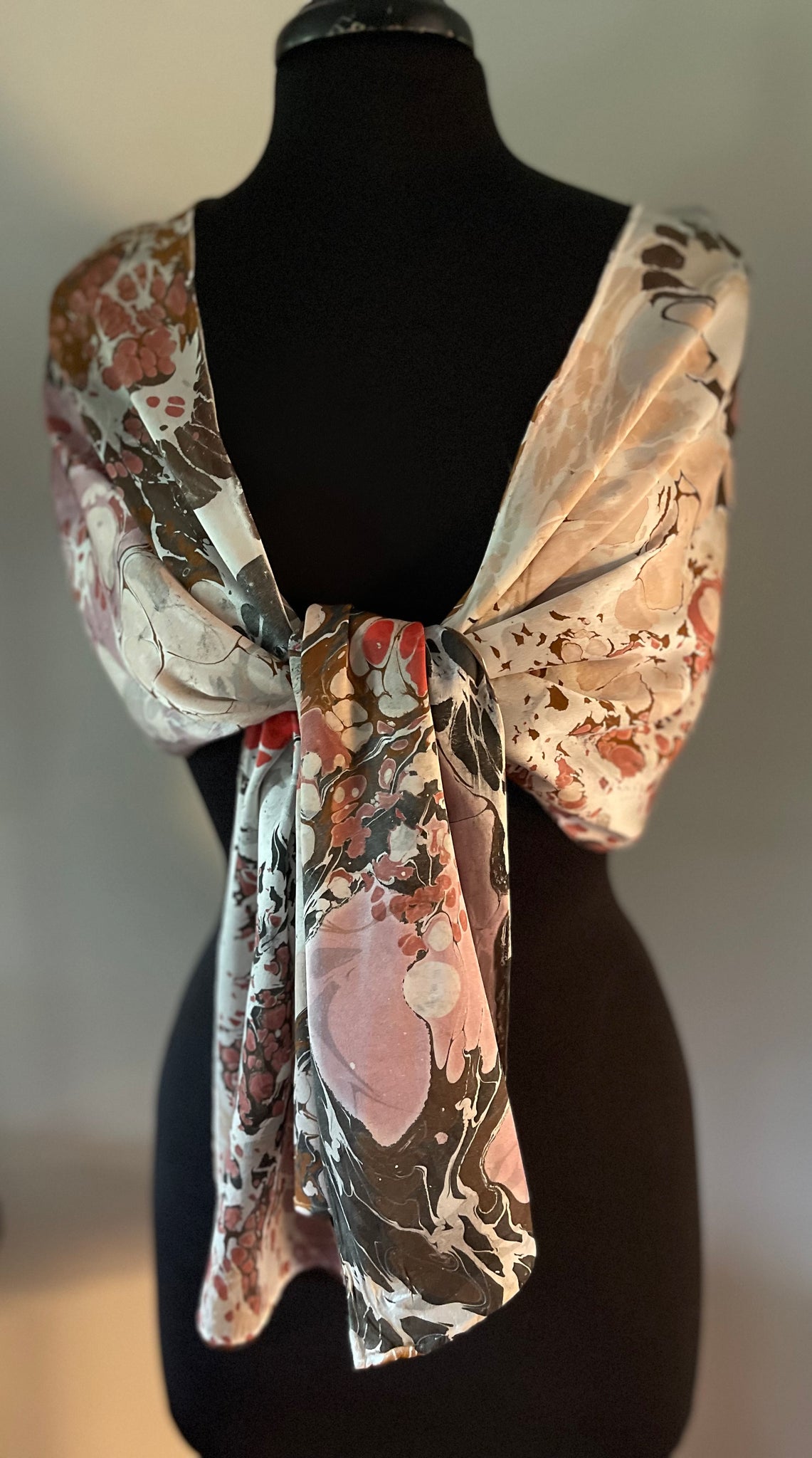 This beautiful silk is 19.5 mm charmeuse with hand rolled edges. It can be worn as a scarf, belt or wrap. It makes a lovely table runner and a unique wall hanging. All of our pieces come wrapped for gift giving in our exclusive water marbled paper! Each includes a picture postcard with care instructions. A scarf tying guide is also included.