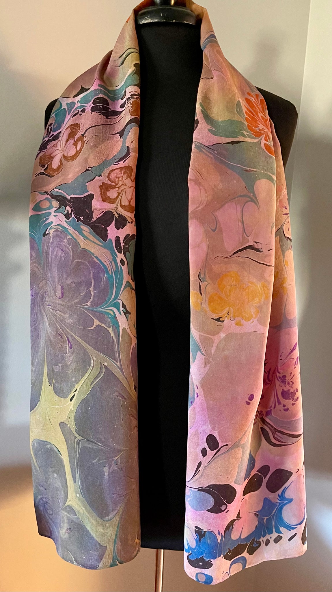 This beautiful silk is 12mm crepe de chine with hand rolled edges. It can be worn as a scarf, belt or wrap or ski. It makes a lovely table runner and a unique wall hanging. All of our pieces come wrapped for gift giving in our exclusive water marbled paper! Each includes a picture postcard with care instructions. A scarf tying guide is also included.