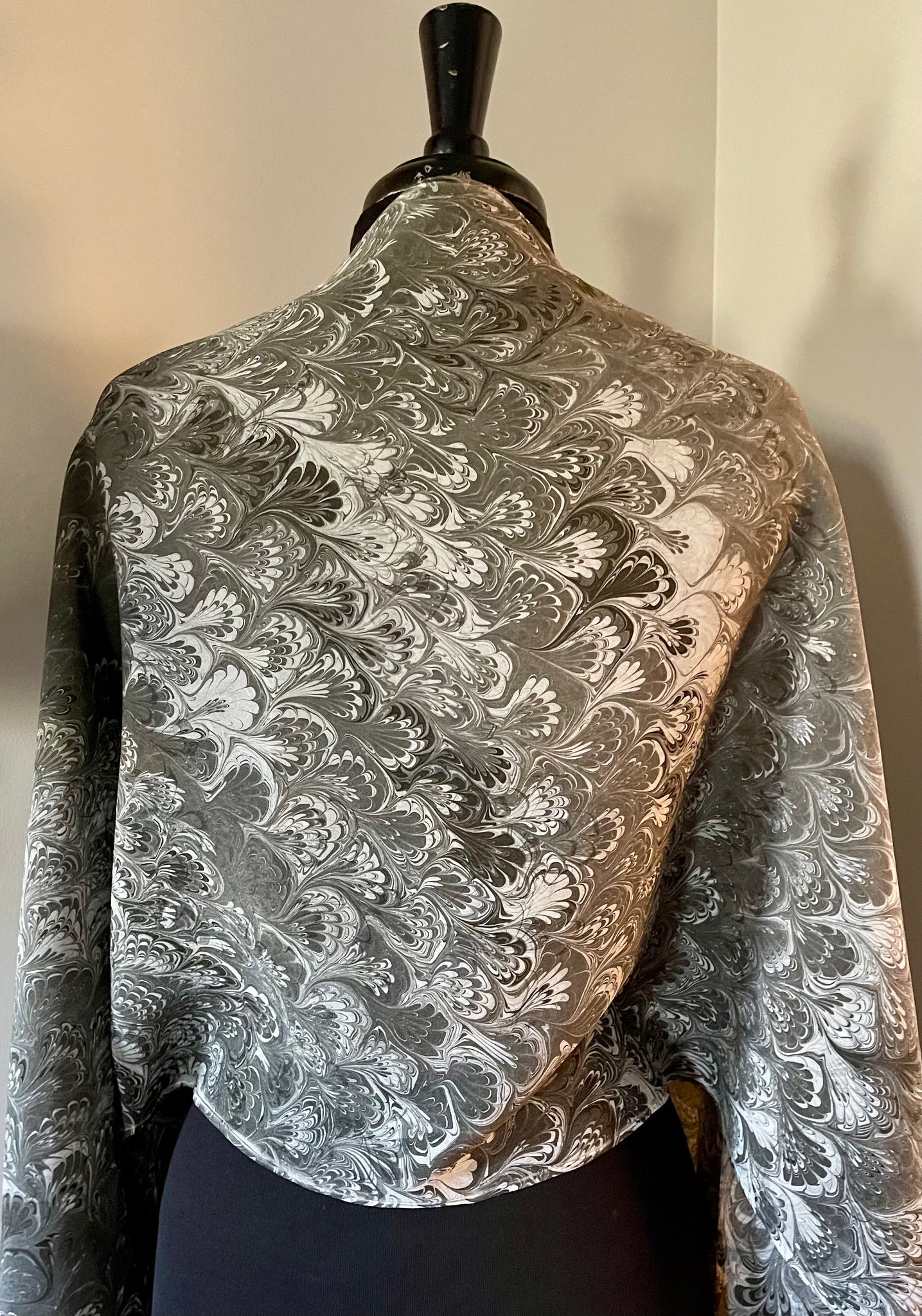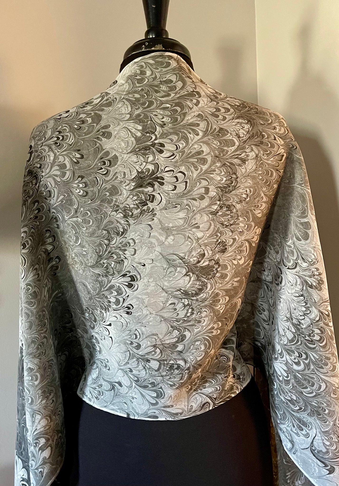 This beautiful silk is 12mm crepe de chine with hand rolled edges. It can be worn as a scarf, belt or wrap or ski. It makes a lovely table runner and a unique wall hanging. All of our pieces come wrapped for gift giving in our exclusive water marbled paper! Each includes a picture postcard with care instructions. A scarf tying guide is also included.